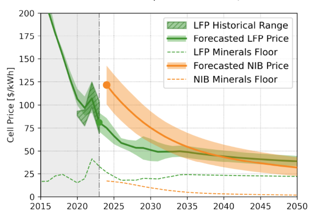 Baseline price forecasts of Li-ion (LFP) vs. Na-ion (NIB) with a hard carbon anode, a NaNiFeMnO cathode with 33% Ni in 2024, slowly decreasing a Ni content to 0 to become NaFeMnO in 2040.